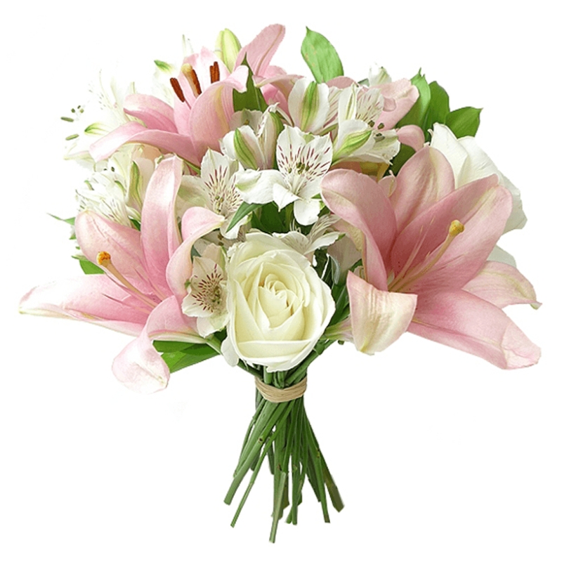 Букет состоит из 4 белые розы, 5 розовых лилий, 10 альстромерий, прозрачная упаковка, атласная лента.