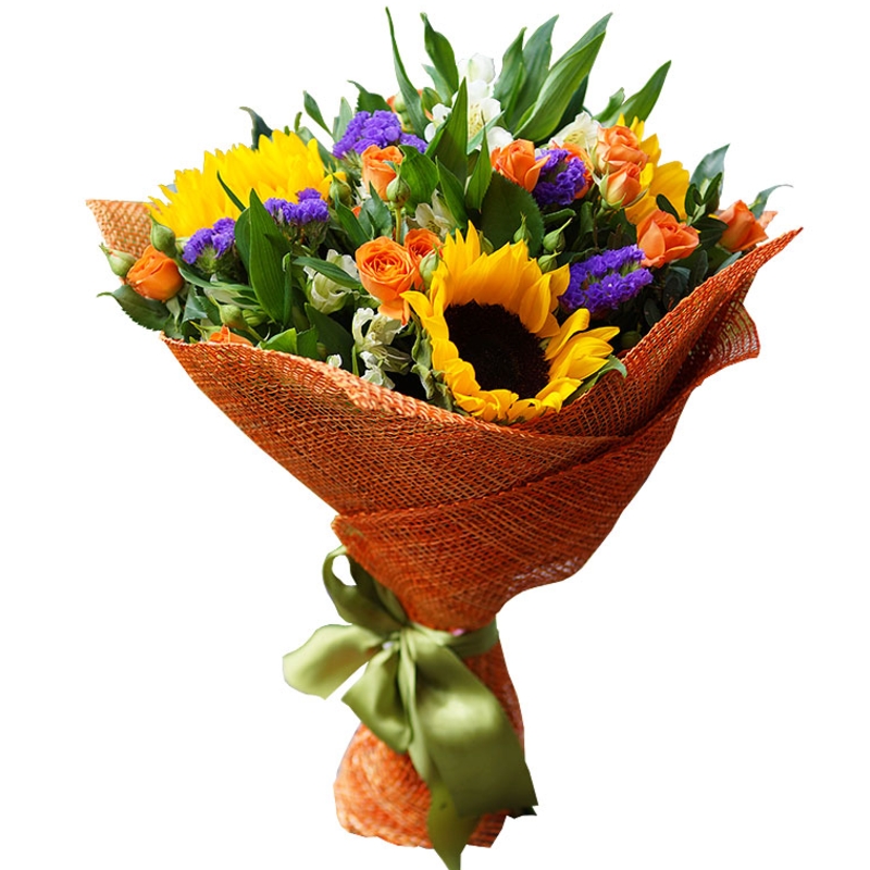 Букет состоит из 5 кустовых роз, 3 подсолнуха, 6 веток альстромерии, 5 веток статицы, зелень, красивая упаковка, атласная лента.
