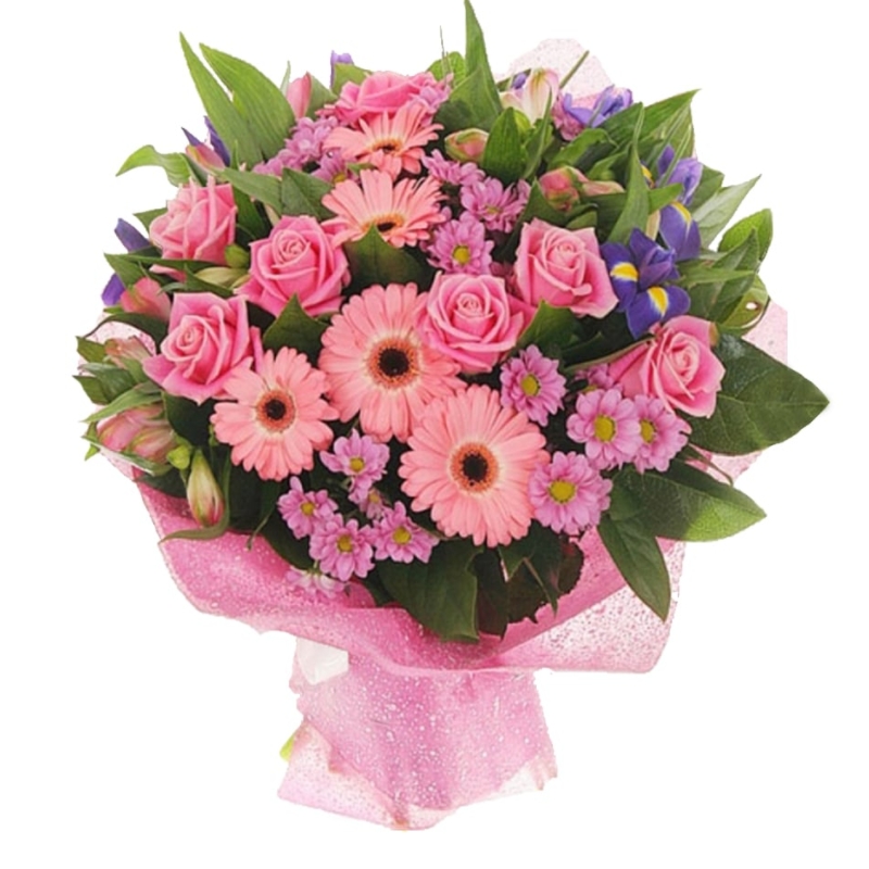 Букет состоит из 9 розовых роз, 4 ветки хризантемы, 5 розовых гербер, 3 альстромерии, 8 ирисов, зелень, красивая упаковка, атласная лента.