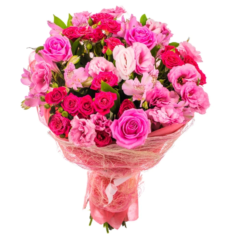 Букет состоит из 3 розовые розы, 3 ветки малиновых роз, 5 веток альстромерии, 4 эустомы, зелень, красивая упаковка, атласная лента.