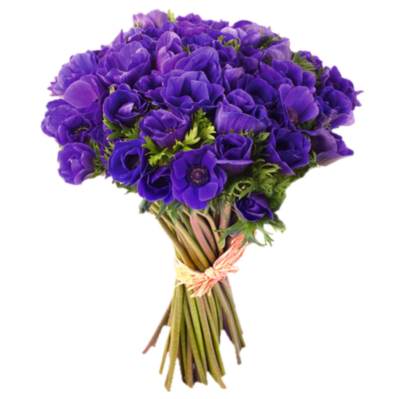 Букет состоит из 51 синий анемон, прозрачная упаковка, атласная лента.