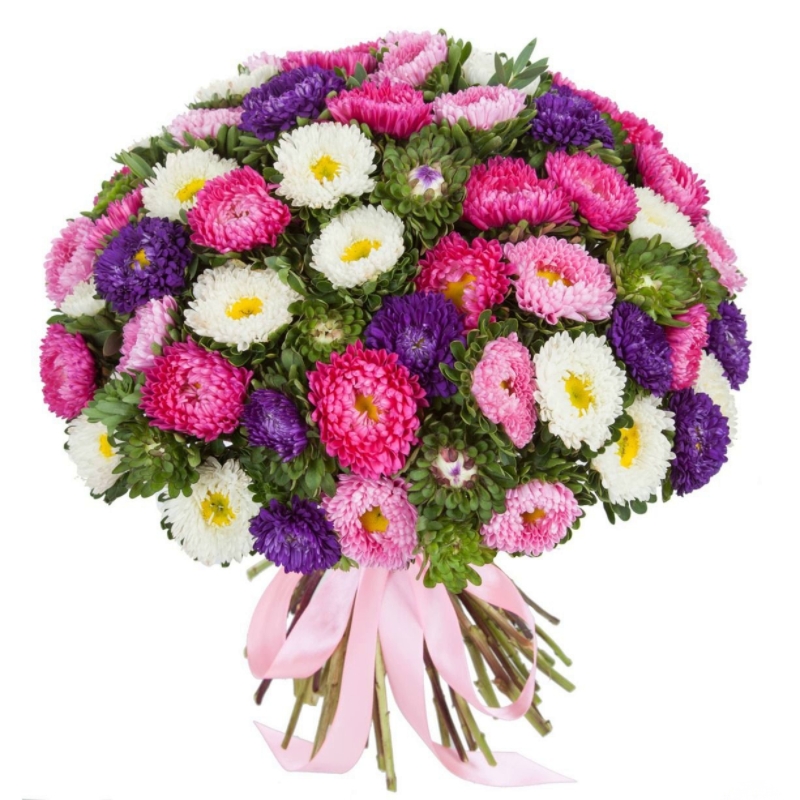 Букет состоит из MIX из 75 астр, зелень, прозрачная упаковка, атласная лента.