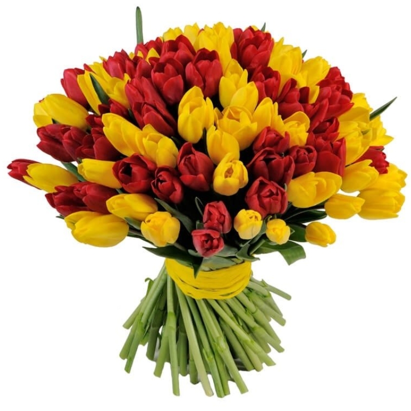 Букет состоит из 51 красный тюльпан, 50 желтых тюльпанов, прозрачная упаковка, атласная лента.