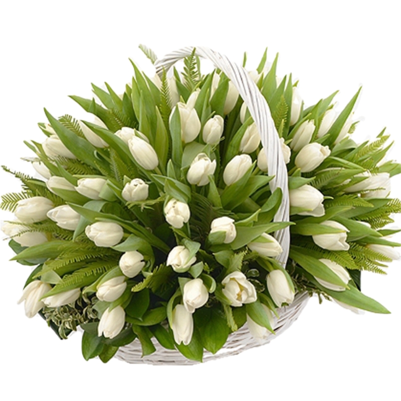 101 белый тюльпан, зелень, корзина.