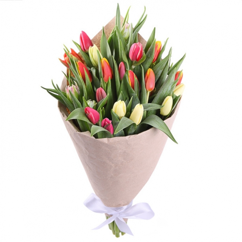 Букет состоит из 11 красных тюльпанов, 10 желтых тюльпанов, крафт, атласная лента.