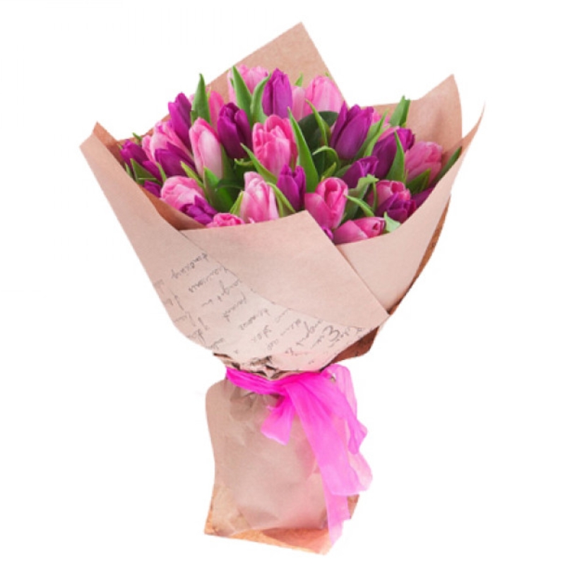 Букет состоит из 13 сиреневых тюльпанов, 12 розовых тюльпанов, крафт, атласная лента.