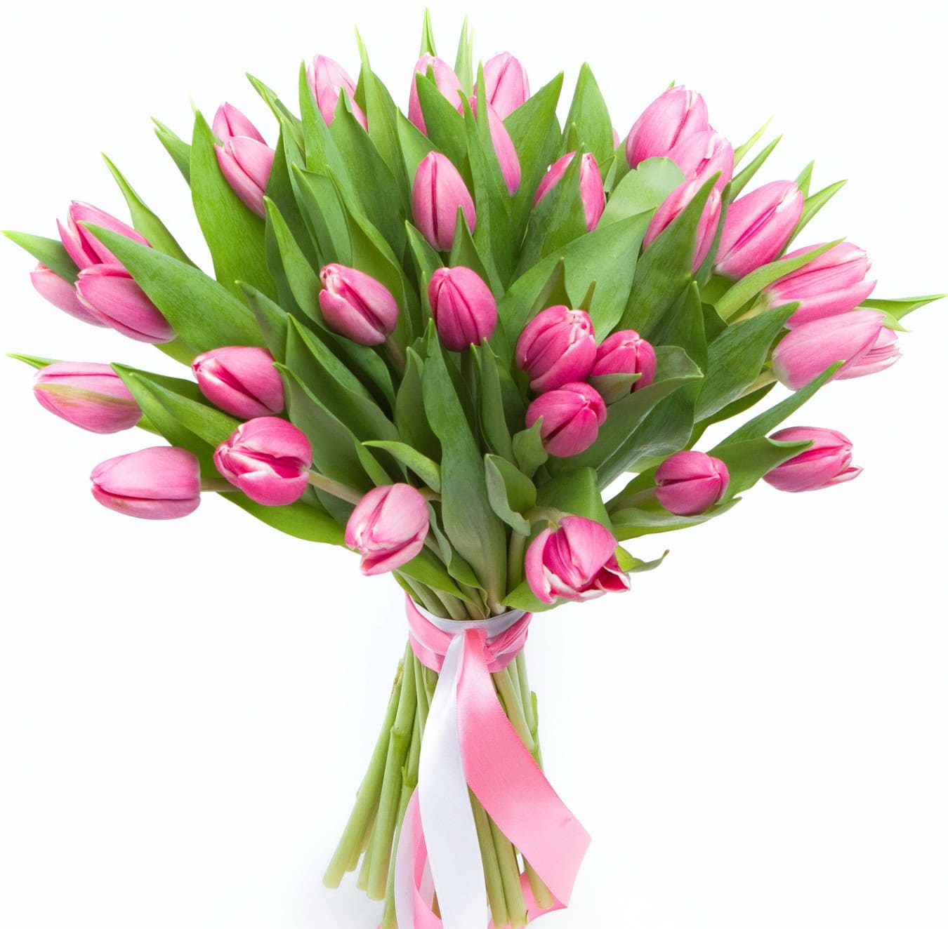 Букет состоит из 35 розовых тюльпанов, прозрачная упаковка, атласная лента.