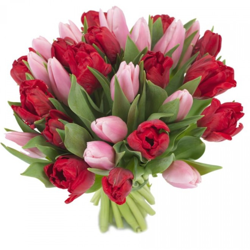 Букет состоит из 18 красных тюльпанов, 17 розовых тюльпанов, прозрачная упаковка, атласная лента.