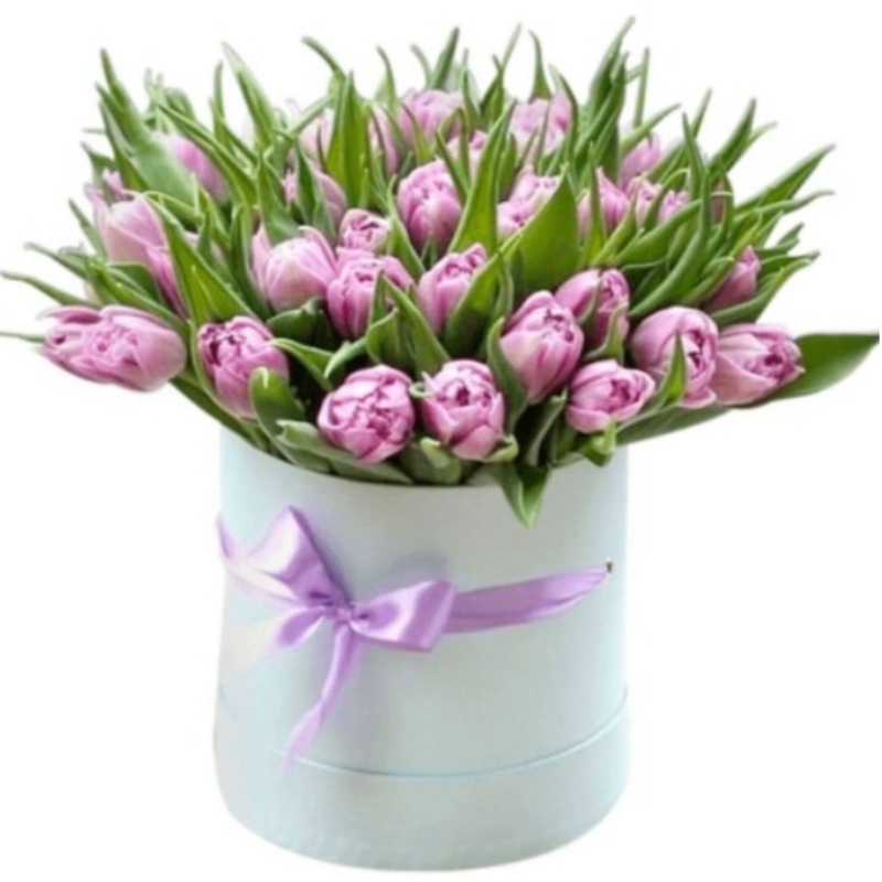 Букет состоит из 35 пионовидных тюльпанов, коробка, атласная лента, оазис.