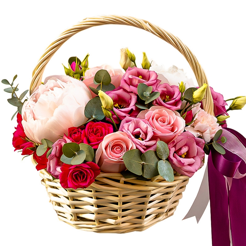 Букет состоит из 2 пиона, 3 розы, 2 ветки кустовой розы, 2 ветки эустомы, 2 гвоздики, зелень, корзина, оазис.