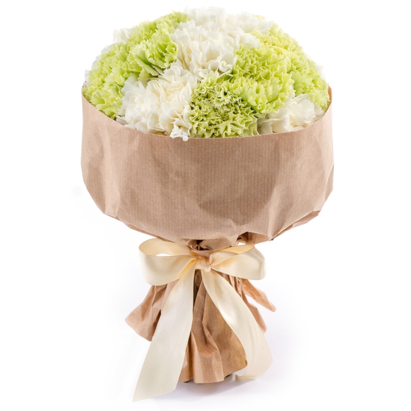 Букет состоит из 8 белых гвоздик, 7 зеленых гвоздик, крафт, атласная лента.