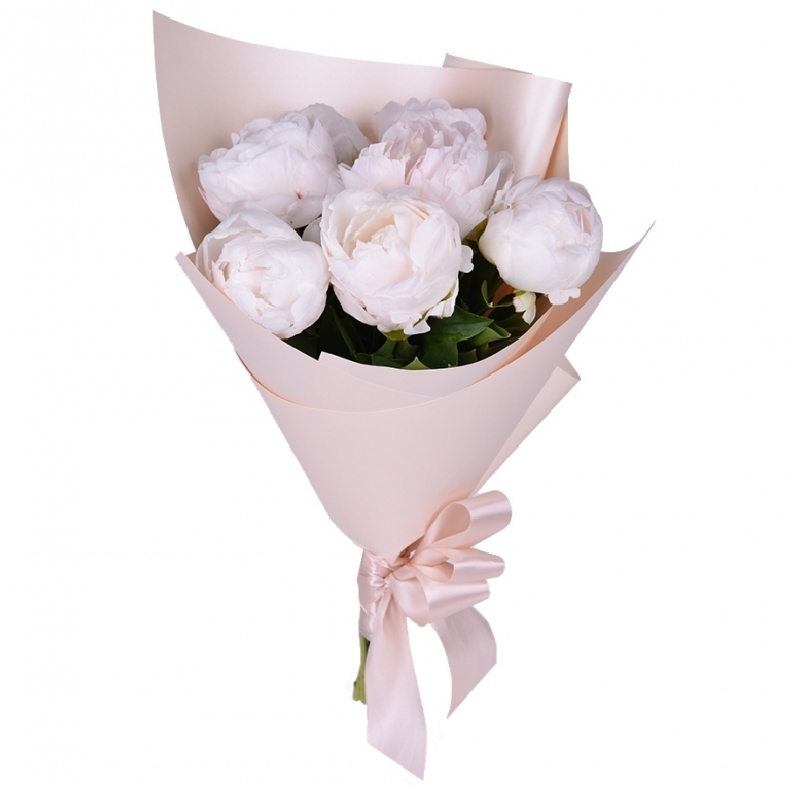 Букет состоит из 7 белых пионов, красивая упаковка, атласная лента.