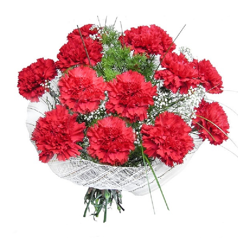 Букет состоит из 13 красных гвоздик, 3 гипсофила, зелень, красивая упаковка, зелень.