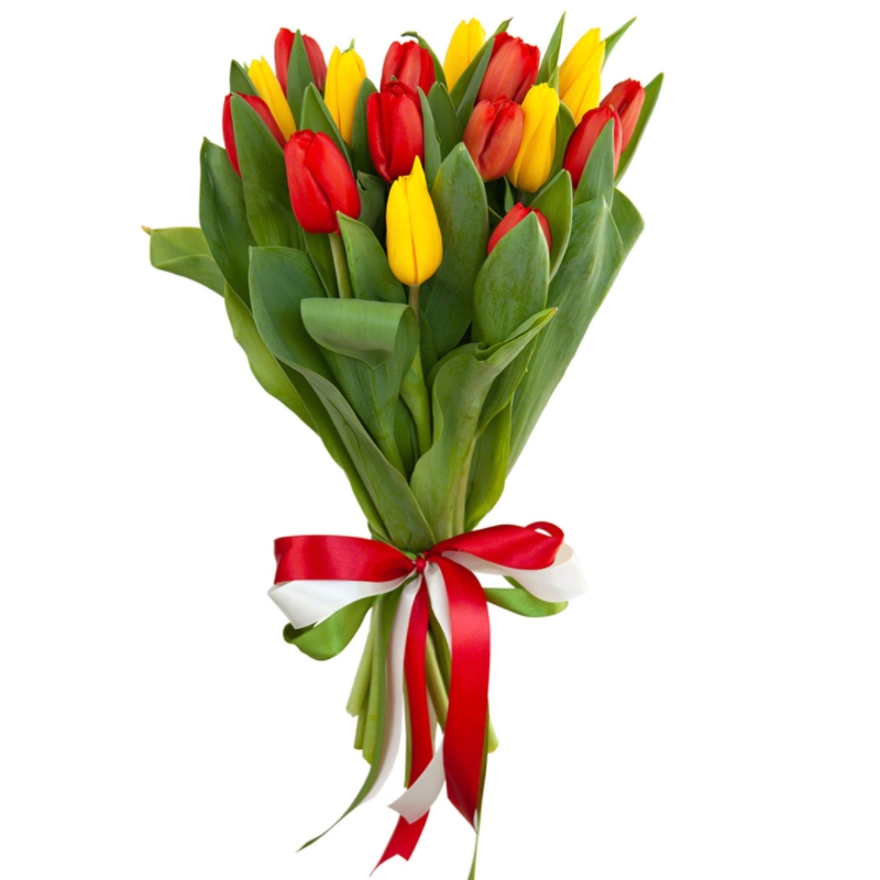 Букет состоит из 10 красных тюльпанов, 7 желтых тюльпанов, прозрачная упаковка, атласная лента.