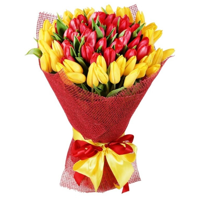 Букет состоит из 40 желтых тюльпанов, 35 красных тюльпанов, красивая упаковка, атласная лента.