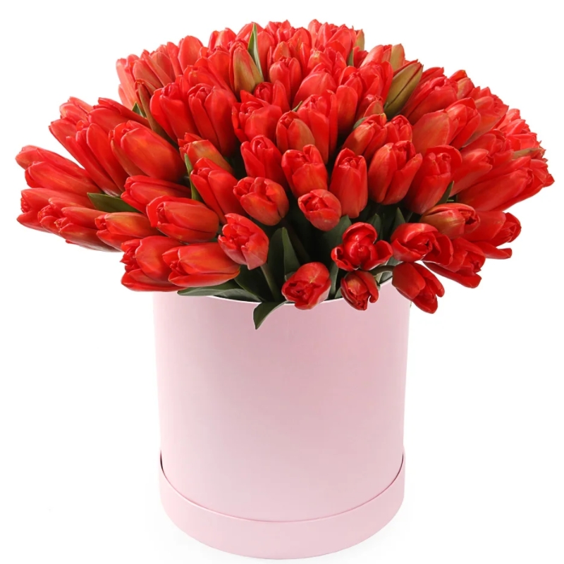 Букет состоит из 75 красных тюльпанов, коробка, оазис.