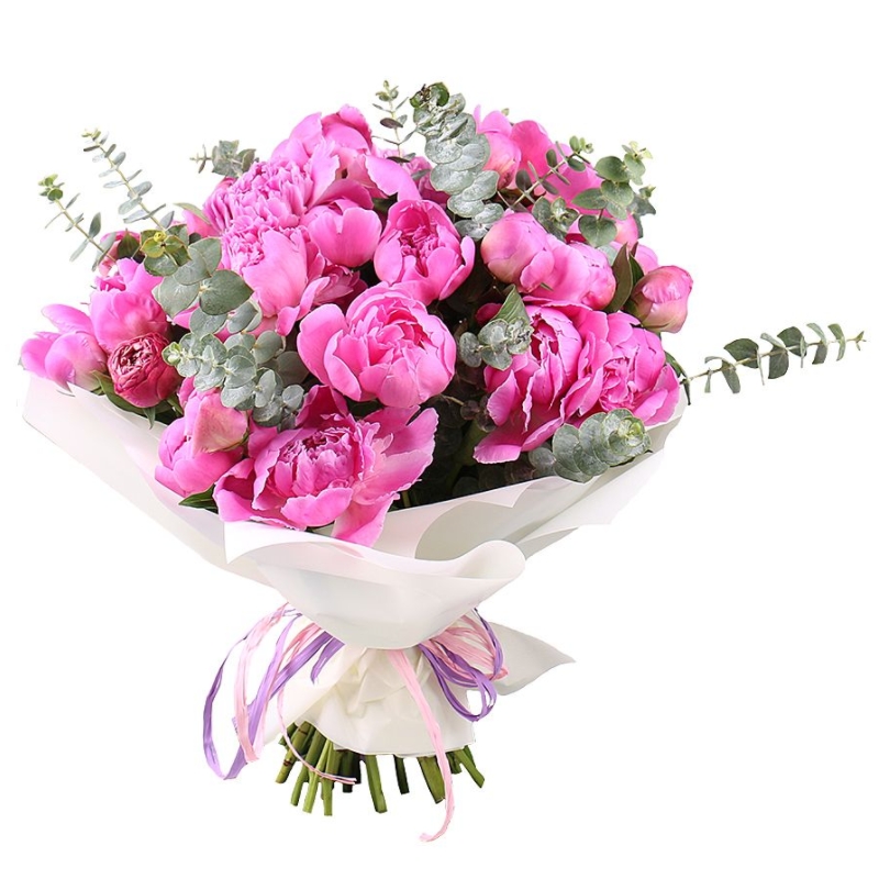 Букет состоит из 25 пионов, эвкалипт, красивая упаковка, атласная лента.