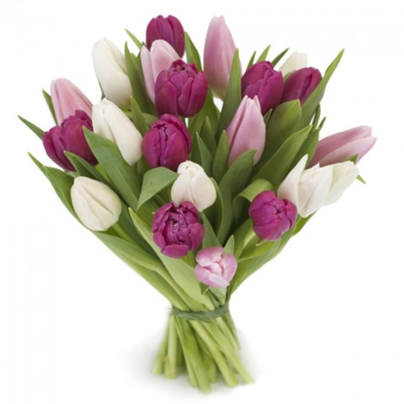 Букет состоит из MIX из 19 тюльпанов, прозрачная упаковка, атласная лента.