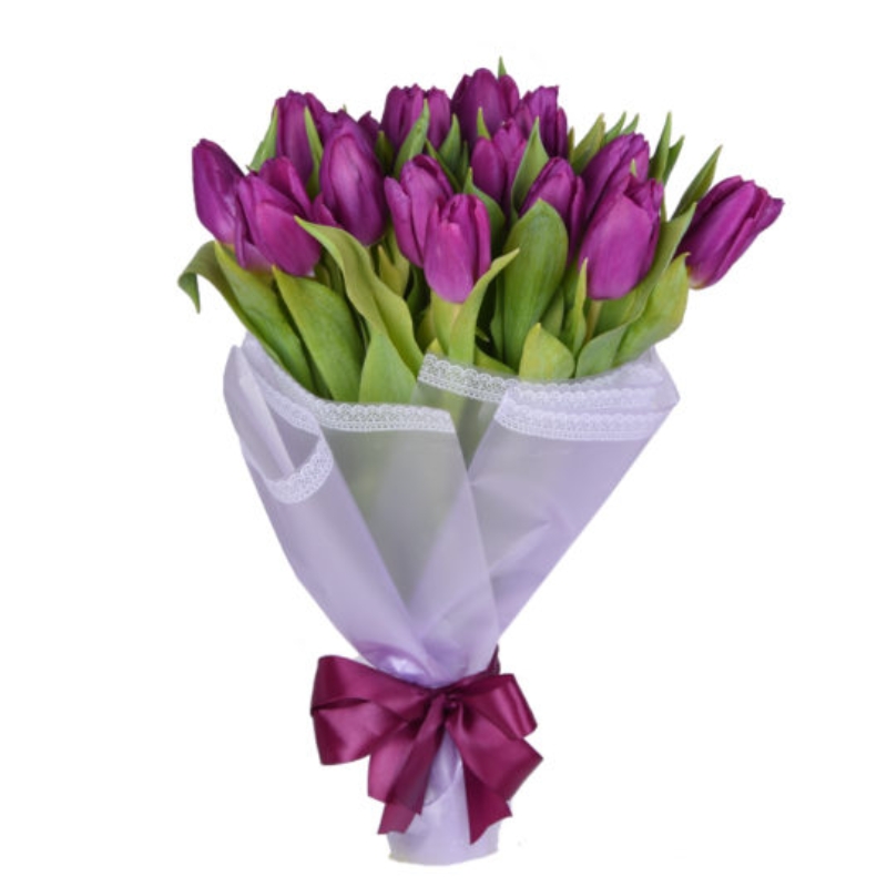 Букет состоит из 15 сиреневых тюльпанов, красивая упаковка, атласная лента.