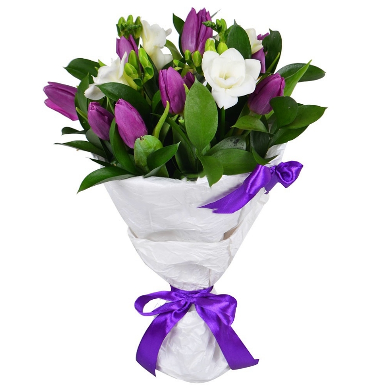 Букет состоит из 9 сиреневых тюльпанов, 4 белые фрезии, зелень, крафт, атласная лента.
