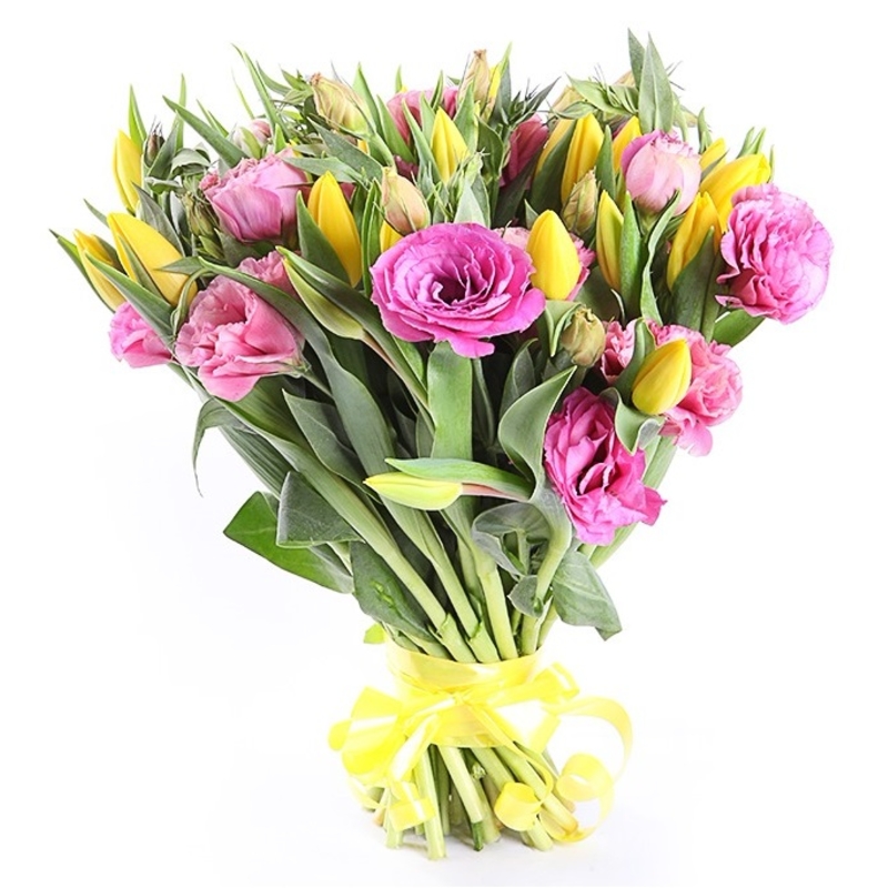 Букет состоит из 19 желтых тюльпанов, 8 веток эустомы, зелень, прозрачная упаковка, атласная лента.