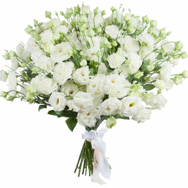 Букет состоит из 25 веток белой эустомы, прозрачная упаковка, атласная лента.