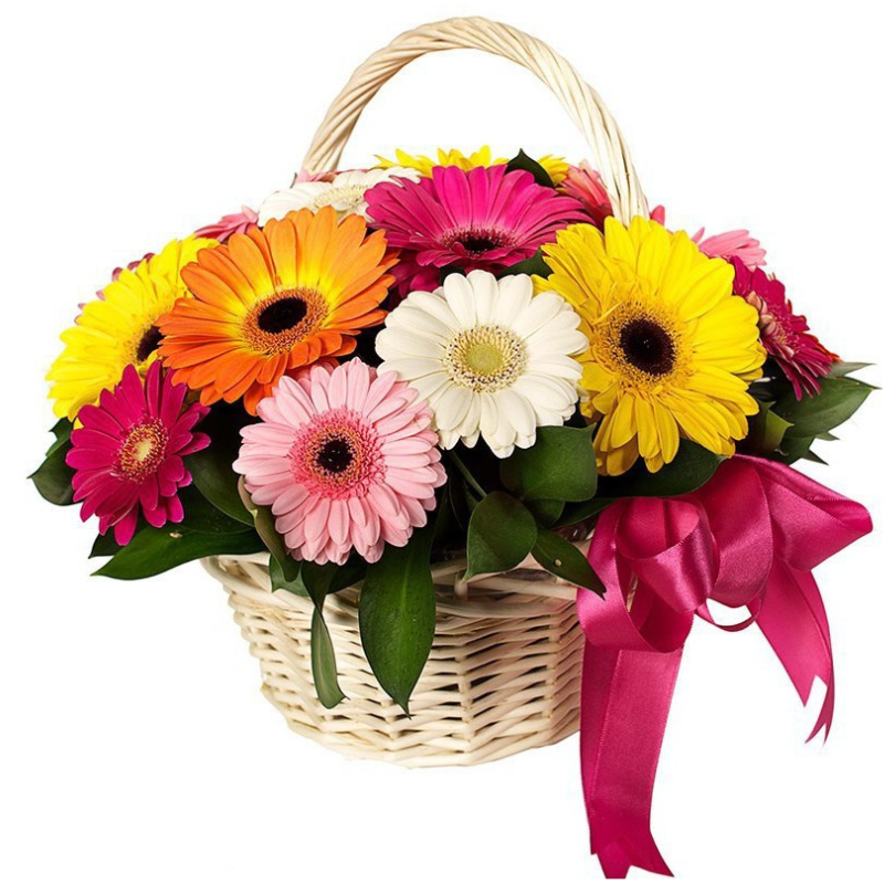 Букет состоит из MIX 15 из гербер, зелень, корзина, атласная лента.