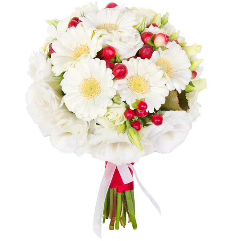 Букет состоит из 5 веток эустомы, 5 гербер, 2 ветки гиперикума, атласная лента.