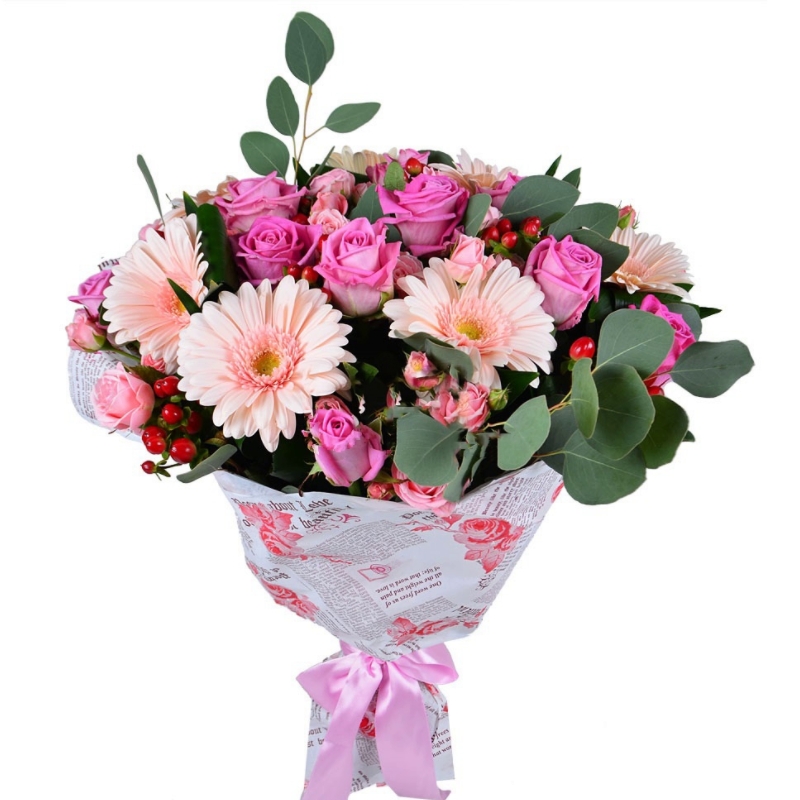 Букет состоит из 11 розовых роз, 7 кустовых роз, 7 гербер, 6 гиперикум, эвкалипт, крафт, атласная лента.