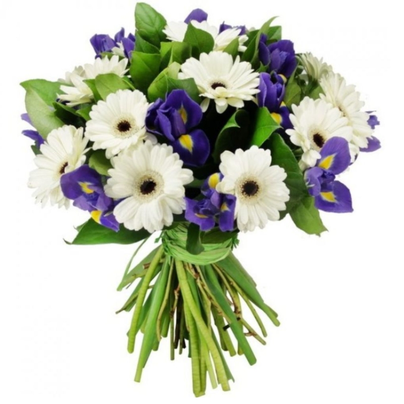 Букет состоит из 15 гербер, 16 ирисов, салал, прозрачная упаковка, атласная лента.