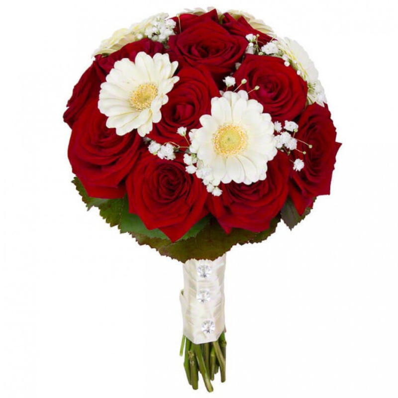 Букет состоит из 12 красных роз, 5 гербер, 1 гипсофила, зелень, атласная лента.