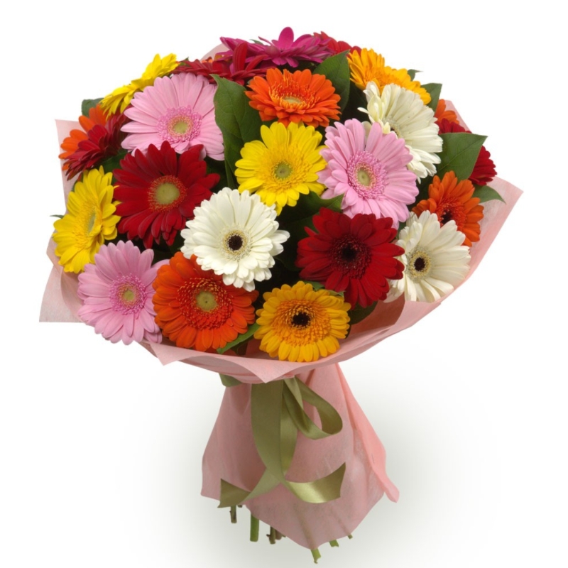 Букет состоит из MIX из 35 гербер, красивая упаковка, атласная лента.
