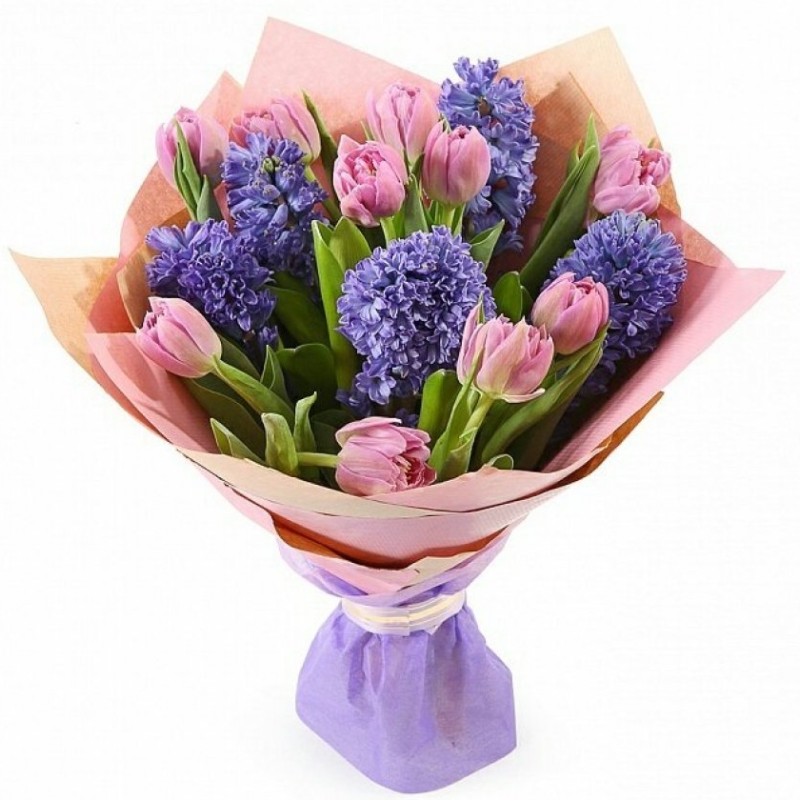 Букет состоит из 7 гиацинтов, 10 розовых тюльпанов, красивая упаковка, атласная лента.