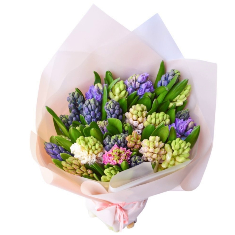 Букет состоит из 25 гиацинтов, красивая упаковка, атласная лента.