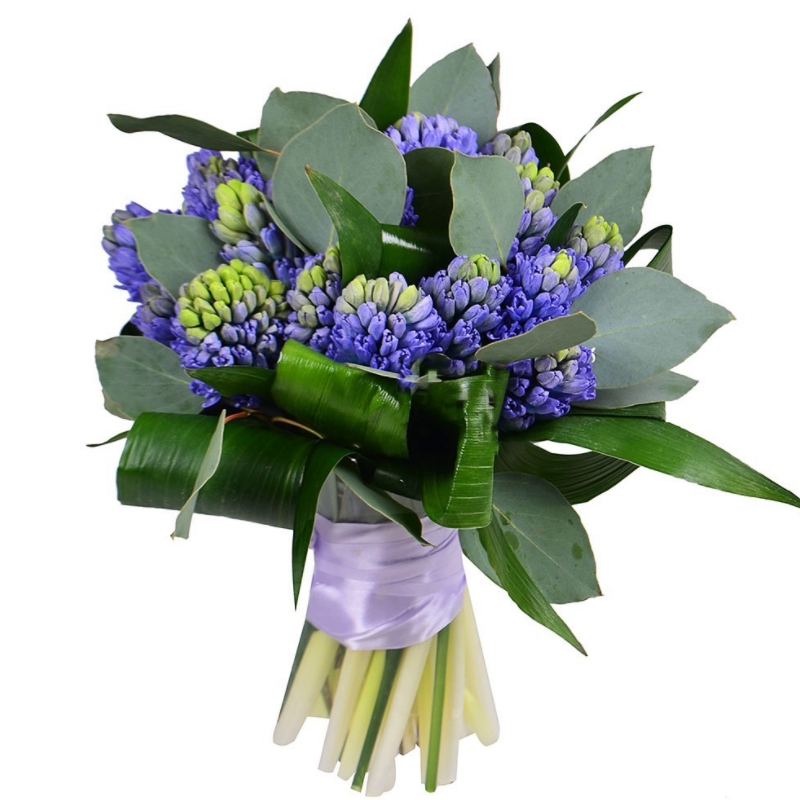 Букет состоит из 19 гиацинтов, аспидистра, эвкалипт, прозрачная упаковка, атласная лента.