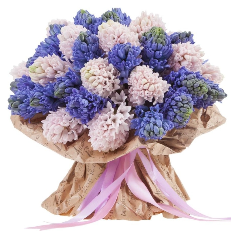 Букет состоит из MIX из 35 гиацинтов, крафт, атласная лента.