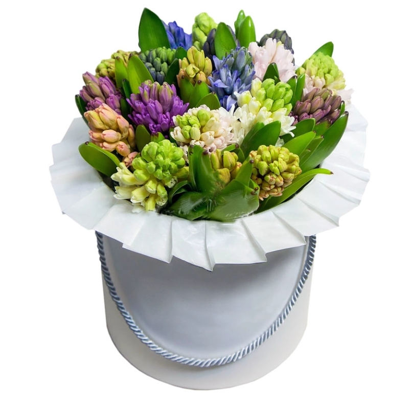 Букет состоит из 19 гиацинтов, коробка, оазис.