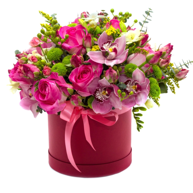 Букет состоит из 7 роз, 7 орхидей, 3 ветки кустовой розы, 5 веток хризантемы, 5 фрезий, 7 гиперикум, 3 солидаго, зелень, коробка, оазис.