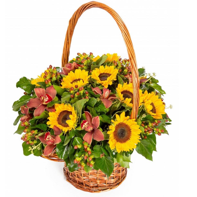 Букет состоит из 11 подсолнухов, 11 орхидей, 11 веток гиперикума, зелень, корзина, оазис.