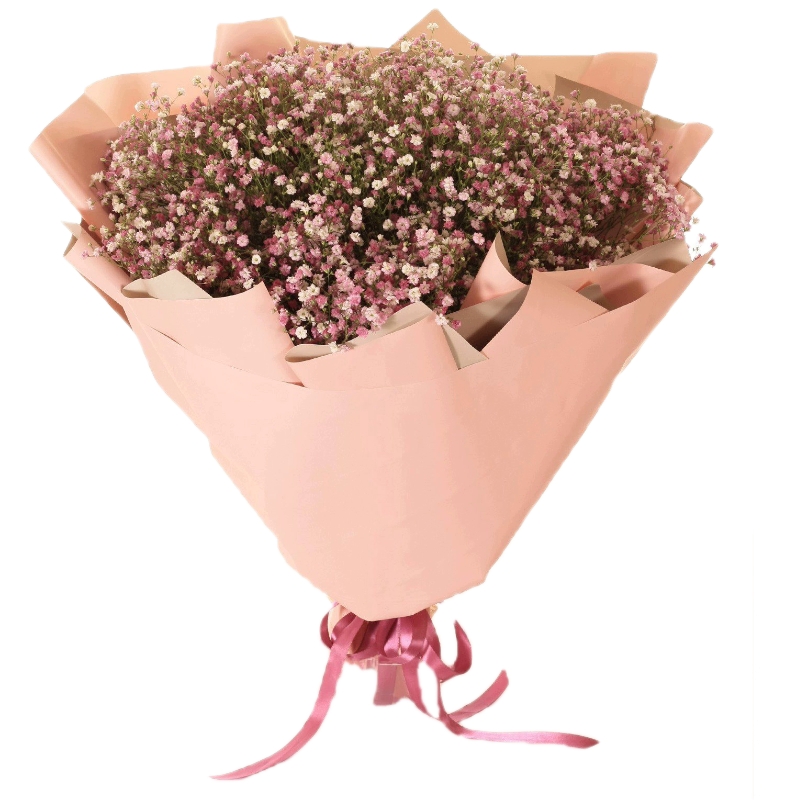 Букет состоит из 15 веток розовой гипсофилы, крафт, атласная лента.