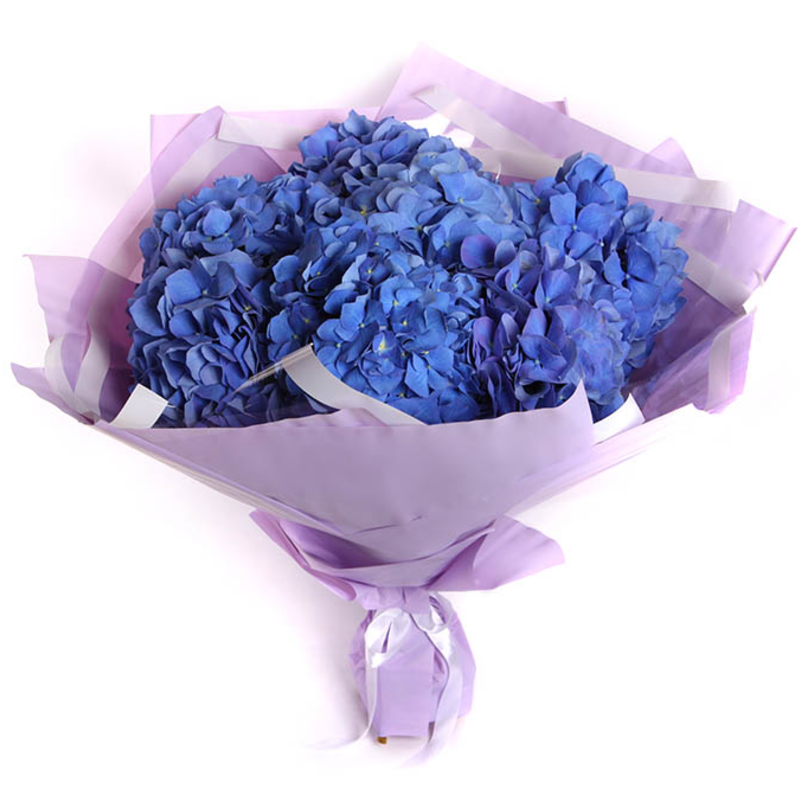 Букет состоит из 7 синих гортензий, красивая упаковка, атласная лента.