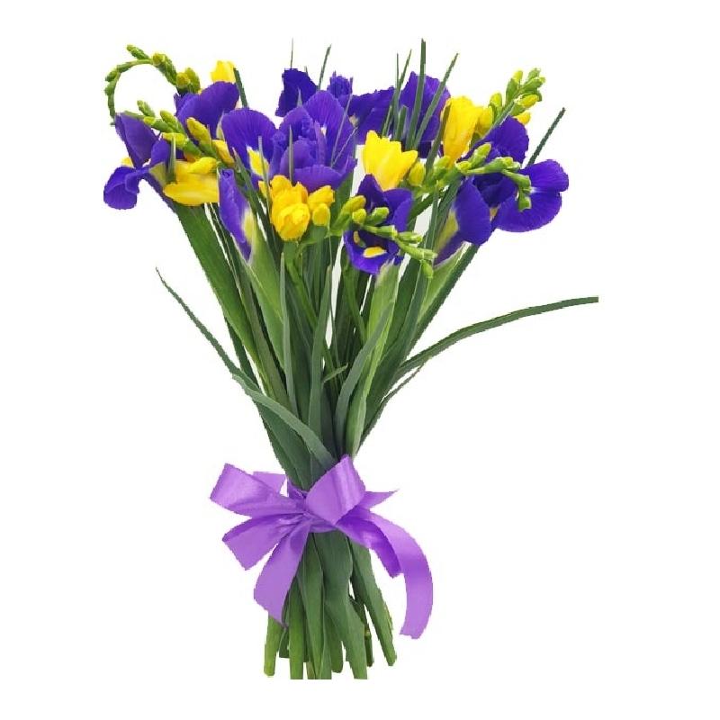 Букет состоит из 10 ирисов, 5 желтых фрезий, прозрачная упаковка, атласная лента.