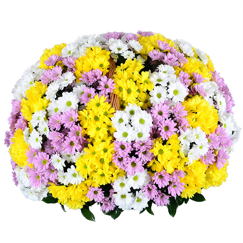 MIX из 51 ветки белых / желтых и розовых хризантем, оазис, корзина.