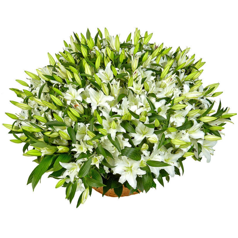 Букет состоит из 51 лилия, корзина, оазис.
