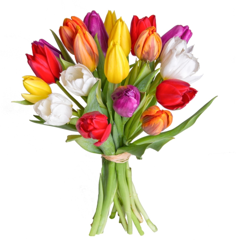 Букет состоит из MIX из 19 тюльпанов, прозрачная упаковка, атласная лента.