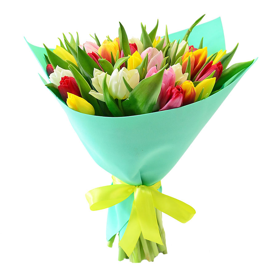 Букет состоит из MIX из 45 красных / желтых / белых и розовых тюльпанов, красивая упаковка, лента.