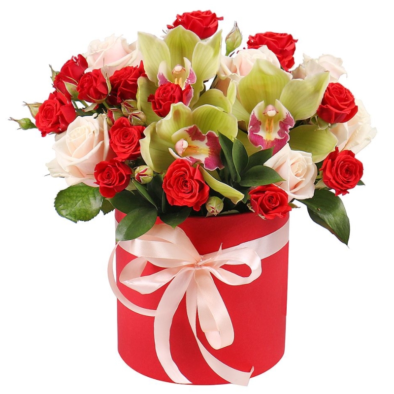 Букет состоит из 7 кремовых роз, 3 ветки кустовых роз, 3 орхидеи, коробка, оазис, атласная лента.