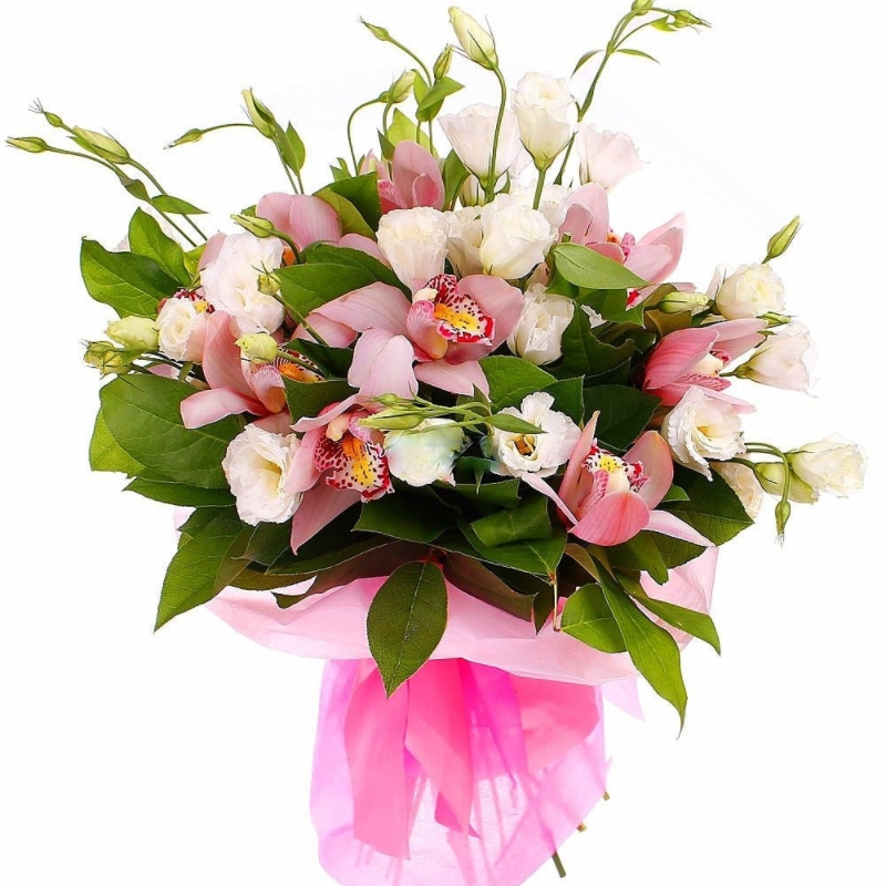 Букет состоит из 9 розовых орхидей, 6 веток эустомы, зелень, красивая упаковка, атласная лента.