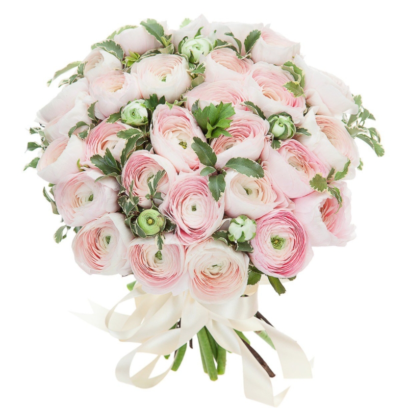 Букет состоит из 31 розовый ранункулюс, питтоспорум, прозрачная упаковка, атласная лента.