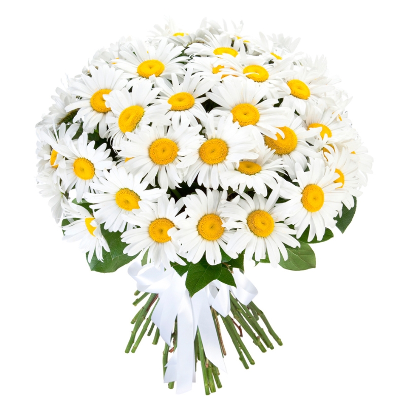 Букет состоит из 55 садовых ромашек, прозрачная упаковка, атласная лента.